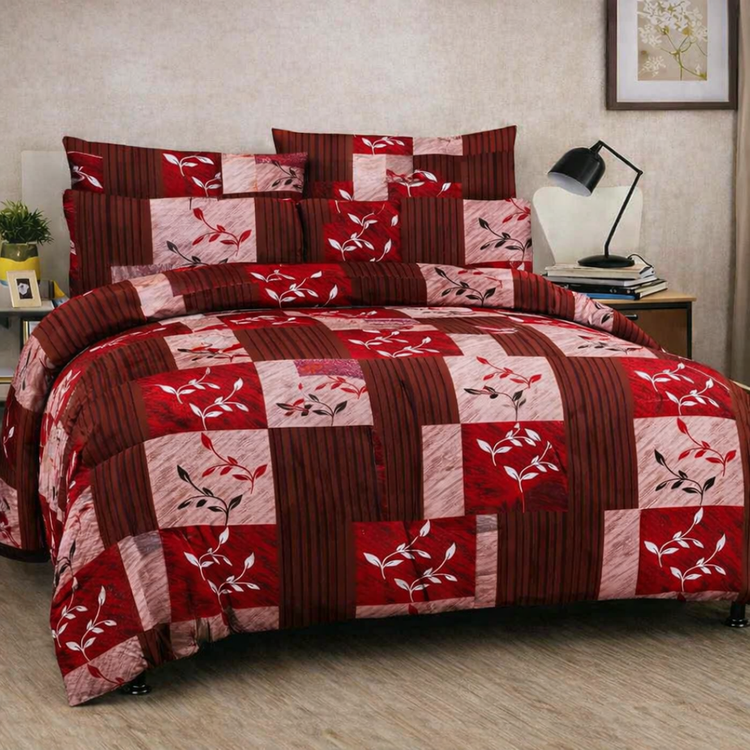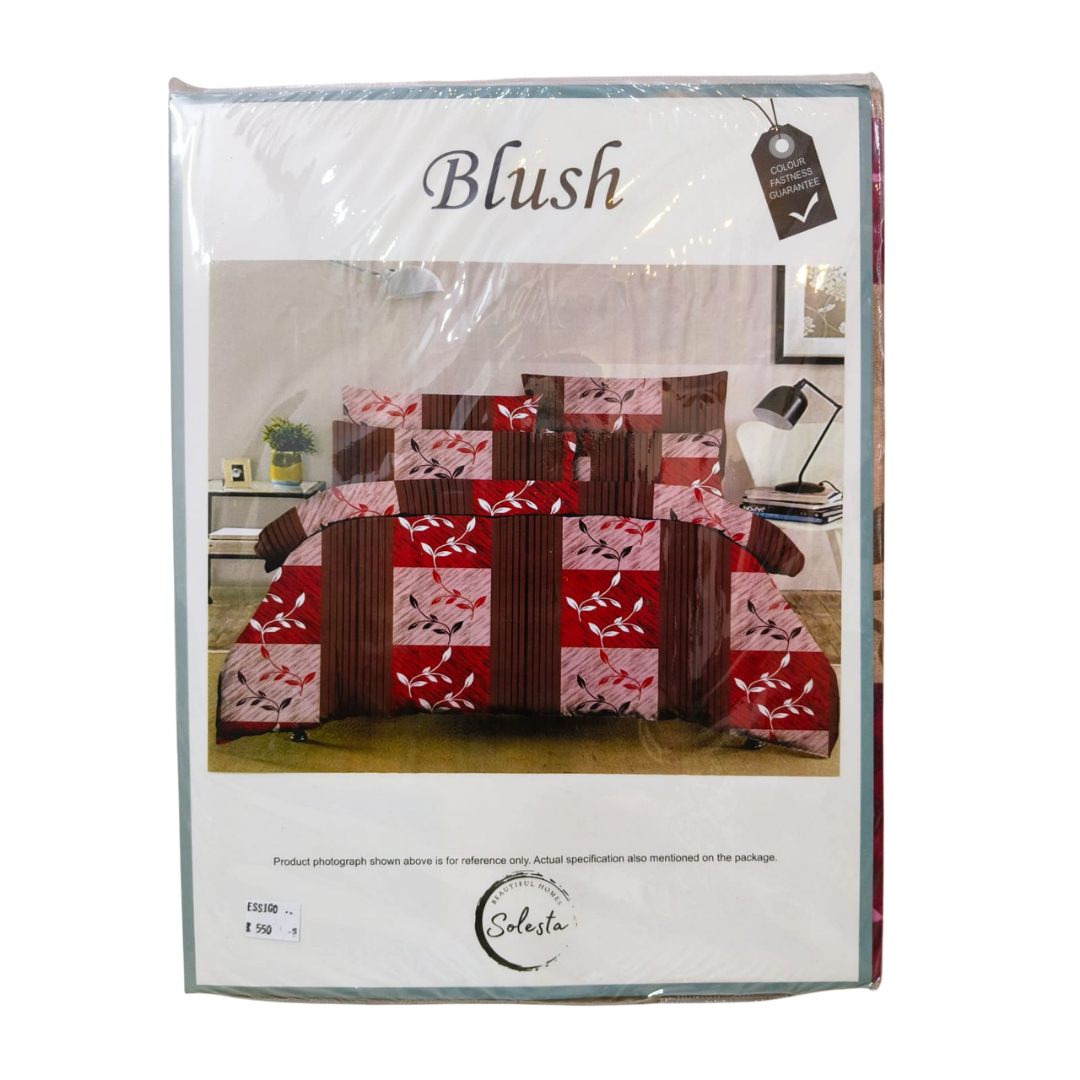 Bring warmth and elegance to your bedroom with the Solesta Blush bedsheet set, featuring a vibrant patchwork design in shades of red, pink, and brown. The floral and striped motifs add a touch of charm, while the soft cotton fabric ensures breathable comfort and a smooth finish. Perfect for modern interiors, this set blends style with everyday usability.