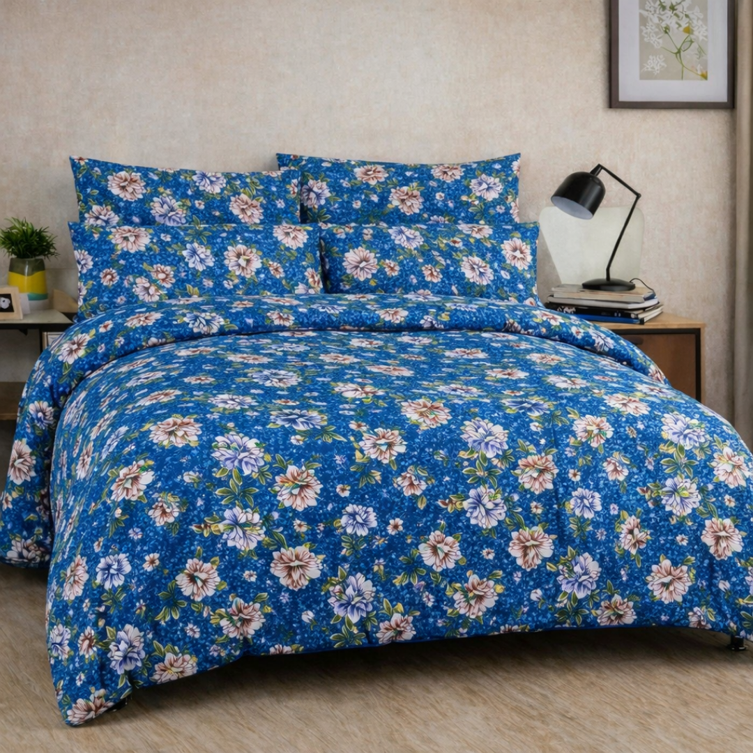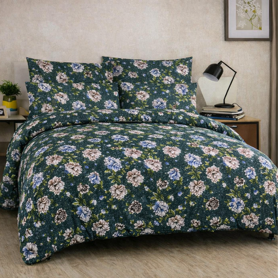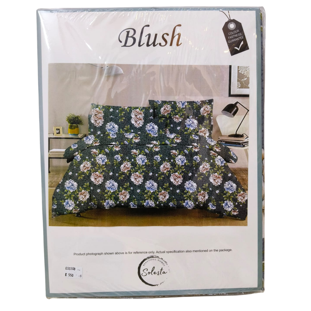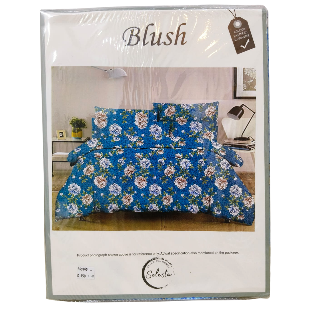 Transform your bedroom into a serene retreat with the Solesta Blush bedsheet set, featuring a rich teal base and blooming floral motifs in pink, white, and yellow. Crafted from soft cotton, this set offers breathable comfort and a smooth finish that complements both modern and traditional interiors.