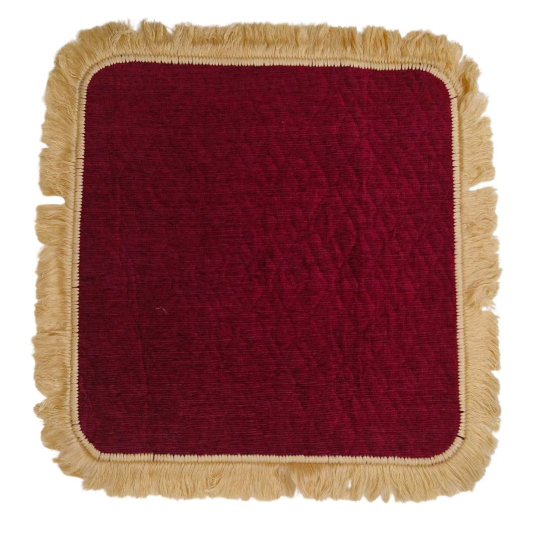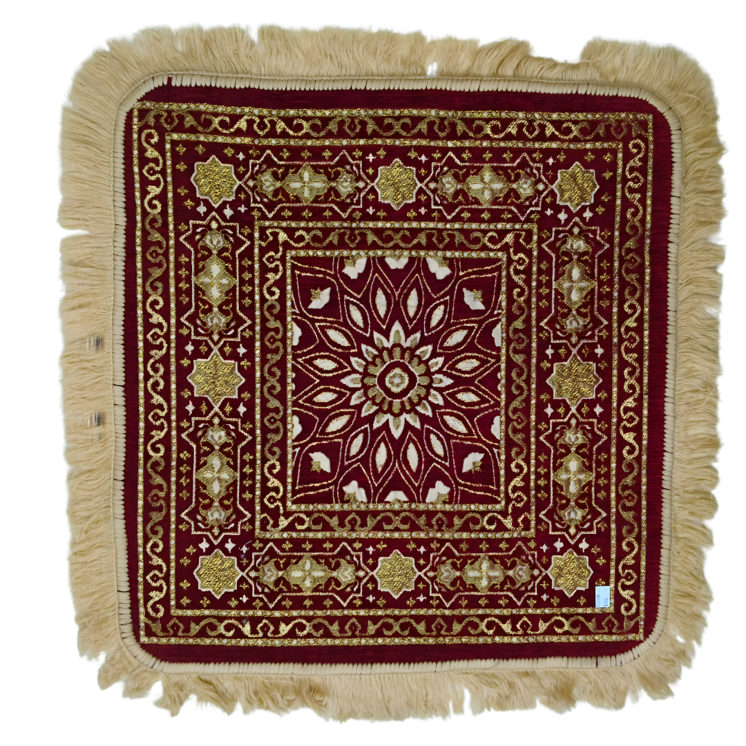 This premium quality Pooja Aasan features a deep Red base with intricate golden floral and geometric motifs, bordered by a soft beige fringe. Its elegant craftsmanship makes it perfect for daily rituals, meditation, or festive occasions, adding a touch of tradition and luxury to your sacred space.
